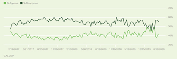 Αν και η οικονομική πολιτική του Τραμπ πριν από την πανδημία είχε μάλλον θετικά αποτελέσματα, η ανεργία είχε πέσει στα χαμηλότερα επίπεδα (ΠΙΝΑΚΑΣ 1) και η αύξηση του GDP ακολούθησε σταθερή τάση (ΠΙΝΑΚΑΣ 2), οι επιτυχίες αυτές δεν μεταφράστηκαν σε αποδοχή (ΠΙΝΑΚΑΣ 3).