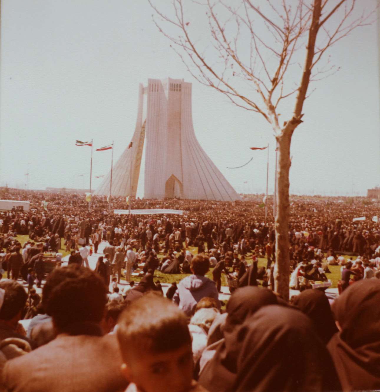 Μια μέρα πήγαμε σε μια τεράστια διαδήλωση. Γύρω από το Αζαντί, την ισλαμική αψίδα – σύμβολο της Τεχεράνης, είχαν συγκεντρωθεί 2-3 εκατομμύρια φανατικοί οπαδοί της Ισλαμικής Δημοκρατίας. Τρώγαμε άγνωστα φρούτα και κάτι σαν ωμό κανταΐφι περιχυμένο με ελαφρύ σιρόπι τριαντάφυλλο σε γυάλινα μπολ, που τα ξέπλεναν μέσα σε ένα μαύρο από τη βρώμα νερό και τα σκούπιζαν με ένα εξίσου βρωμερό πανί, και ακούγαμε την ομιλία του Χομεϊνί από μεγάφωνα-ντουντούκες στερεωμένα σε «ντατσούν», που ήταν σταματημένα παντού ανάμεσα στον κόσμο.