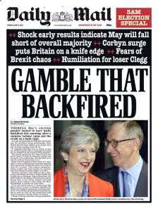 Ακόμα οι δεξιές φυλλάδες που έπαιξαν άγρια υπέρ του Brexit και στήριξαν τους Συντηρητικούς και τη Μέι, σήμερα το πρωί κυκλοφόρησαν με ένα κοινό συμπέρασμα και προσωποποιώντας το εκλογικό αποτέλεσμα: ο τζόγος της Μέι εκπυρσοκρότησε. Ούτε τρομοκρατία, ούτε άλλοι λόγοι. Η υπόθεση αυτών των εκλογών είχε πρόσωπο. Και προσωπική είναι η αποτυχία.