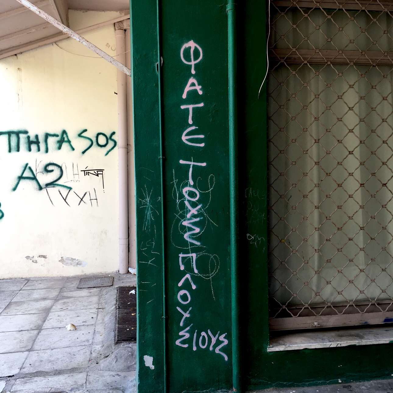 Το all times classic «Μπάτσοι, γουρούνια, δολοφόνοι» μοιάζει ανώδυνο διακοσμητικό σε τοίχο νηπιαγωγείου, σε σχέση με τα άλλα συνθήματα που φύονται στις προσόψεις των σπιτιών μας (οι… καλλιτέχνες δρόμου έχουν ιδιαίτερη προτίμηση στις φρεσκομπογιαντισμένες) από Κολωνάκι ως Αιγάλεω και από Ίλιον ως Γλυφάδα: Οι λέξεις ψόφος, μίσος, κρεμάλα, λιντσάρισμα, θάνατος, σφαγή, κάψτε, σκοτώστε κλπ. επαναλαμβάνονται ξανά και ξανά μέσα από δεκάδες προτροπές για πόλεμο ενάντια στην αστική τάξη, στους μετανάστες, στην κυβέρνηση, στη Δημοκρατία, στον Πολιτισμό.
