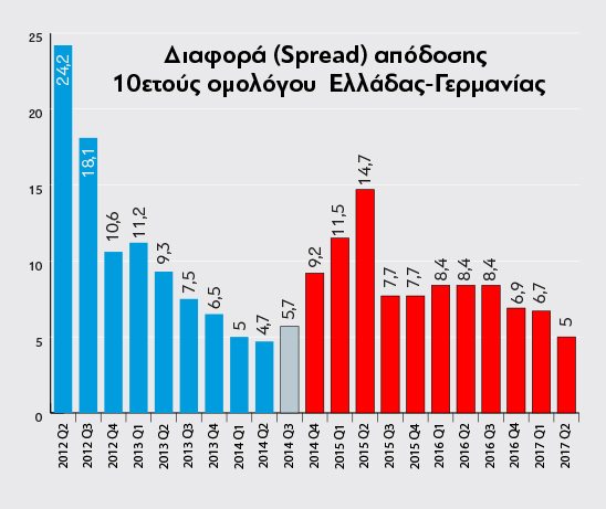 Η κυβέρνηση Σαμαρά-Βενιζέλου παρέλαβε το spread (διαφορά επιτοκίου Ελλάδας –Γερμανίας) του δεκαετούς ομολόγου στο 24% (Ιούνιος 2012) και 2 χρόνια μετά το έφτασε στο 4,7% (Ιούνιος 2014). Το spread αυξήθηκε το 4ο τρίμηνο του 2014, καθώς η επέλαση ΣΥΡΙΖΑ σκόρπιζε ανασφάλεια και αβεβαιότητα στις αγορές ομολόγων. Δυόμιση χρόνια μετά, η κυβέρνηση Τσίπρα-Καμμένου μόλις που κατάφερε να αφαιρέσει την επιβάρυνση που προκάλεσε η έλευση και η διαχειριστική της ανεπάρκεια στο κόστος δανεισμού του ελληνικού δημοσίου. Το spread επέστρεψε εκεί που ήταν το καλοκαίρι του 2014, αφού πρώτα εκτινάχθηκε στο 18,5% λίγες μέρες μετά το δημοψήφισμα (8/7/2015) και παρέμεινε σε σχετικά υψηλά επίπεδα τα δύο χρόνια που η κυβέρνηση «διαπραγματευόταν» τις αξιολογήσεις.