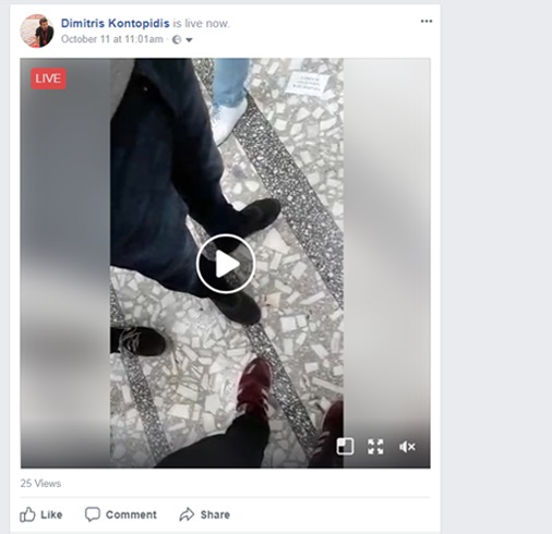 Οπως μαρτυρά το «στιγμιότυπο της ντροπής», που είναι μέχρι και σήμερα στον προσωπικό μου τοίχο στο facebook, έχει προλάβει να καταγραφεί ένα (1) μόλις δευτερόλεπτο στραμμένο στο πάτωμα όπου φαίνονται και τα πόδια των «συντρόφων» που με έχουν στριμώξει σε απόσταση αναπνοής (φορώ κόκκινα παπούτσια). Στο σημείο εκείνο επιτέθηκαν σε εμένα και στο κινητό όπου και κόλλησε η κάμερα στο 1’’ στις 11 π.μ. προτού προλάβει να καταγράψει. Για αυτό και είναι κολλημένο, αλλιώς ως livestreaming θα συνέχιζε να καταγράφει. Προφανώς δεν μπορεί το κινητό και να καταγράφει ταυτόχρονα βίντεο και να κάνει livestreaming και μάλιστα την στιγμή που μου αποδίδονται «σούπερ» ιδιότητες, να επιτίθεμαι και σε φυλλάδια και μάλιστα μπροστά σε τόσους «συντρόφους» (!).