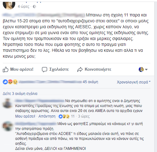 Στο forum της σχολής από την ίδια μέρα του επεισοδίου, πολύ πριν δηλαδή τη δημόσια καταγγελία μου, υπάρχουν μάρτυρες του περιστατικού της ντροπής που χαρακτηριστικά αναφέρουν. «Μπαίνω στη σχολή 11 παρά και βλέπω 15-20 άτομα από το “αυτοδιαχειροζόμενο στεκι ασοεε” οι οποίοι μόλις έχουν καταστρέψει μια εκδήλωση της AIESEC, χωρίς κάποιον λόγο, να έχουν στριμώξει σε μια γωνία έναν από τους ομιλητές της εκδήλωσης αυτής. Τον ομιλητή τον τραμπούκισαν και του έριξαν μερικές σφαλιάρες. Ντράπηκα τόσο πολύ που είμαι φοιτητής σ’ αυτό το πράγμα γιατί πανεπιστήμιο δεν το λες. Ήθελα να βοηθήσω να κάνω κάτι αλλά τι να κάνω μόνος μου».