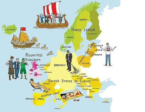 Ο βρετανός (με καταγωγή από τη Σκωτία) ιστορικός Νίαλ Φέργκιουσον (Niall Ferguson) δημοσίευσε στη Wall Street Journal (19 Νοεμβρίου 2011) ένα φουτουριστικό άρθρο με τίτλο «2021: The New Europe» που συνόδευε ένας εικονογραφημένος χάρτης, όπου εμφανίζει τις «Ηνωμένες Πολιτείες της Ευρώπης», με τη Γερμανία στο κέντρο διογκωμένη και γύρω της να υπάρχουν ομάδες χωρών με βάση την κατανομή έργων (ο νότος για διακοπές κ.ο.κ.). Είναι μια Ευρώπη που εξακολουθεί να έχει το ευρώ, αλλά εκείνο που την χαρακτηρίζει είναι η δημοσιονομική ένωση.
