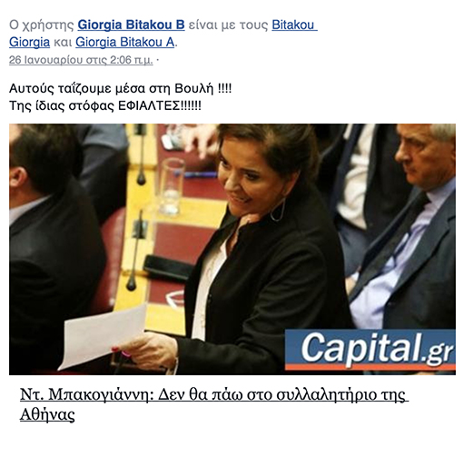 Για παράδειγμα, η εκ των διοργανωτών (δημοσιογράφος και άλλα δηλώνει) Γεωργία Μπιτάκου, που έχει αναλάβει την προβολή του συλλαλητηρίου, την ημέρα που η Ντόρα Μπακογιάννη ανακοίνωσε ότι δεν θα πάει στο συλλαλητήριο, την στόλισε ως εξής.