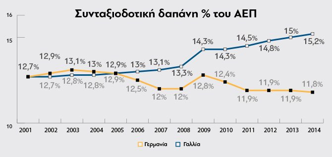 Την τετραετία 2011-2014 η συνταξιοδοτική δαπάνη της Γαλλίας (14,9%) ήταν τρεις μονάδες του ΑΕΠ υψηλότερη της Γερμανίας (11,9%). Την ίδια περίοδο η διαφορά τους στο έλλειμα εκτινάχθηκε (Γαλλία –4,5% και Γερμανία -0,2%).