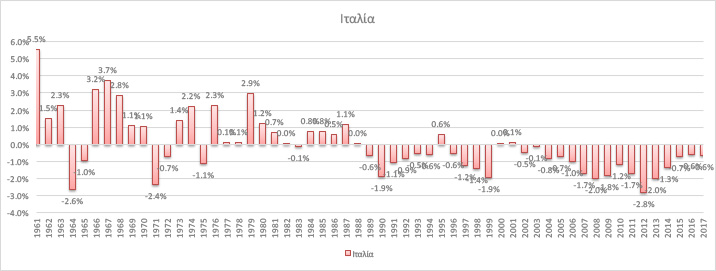 Αλλά και την περίοδο που προηγήθηκε (1981-1998) Ελλάδα και Ιταλία κατατάσσονται πάλι στις δυο τελευταίες θέσεις.