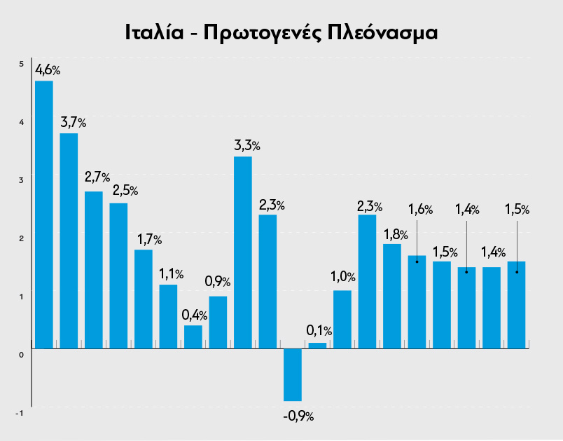 Η Ιταλία παράγει πρωτογενή πλεονάσματα από το 1995 που υπάρχουν διαθέσιμα στοιχεία στη Eurostat με εξαίρεση ένα μόνο έτος (διάγραμμα Ι). Στις 23 από τις 24 χρήσεις της περιόδου 1995-2018, η εκτέλεση του ιταλικού Προϋπολογισμού κατέγραψε πρωτογενές πλεόνασμα. Μοναδική εξαίρεση το 2009, οπότε λόγω της κρίσης εμφάνισε πρωτογενές έλλειμμα 0,9% του ΑΕΠ. Και πάλι, όμως, ήταν η καλύτερη επίδοση στην Ευρωζώνη.