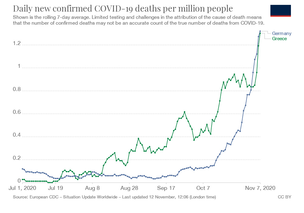 Δείτε, για παράδειγμα τον Αύγουστο. Ο ιός πολλαπλασιαζόταν φυσικά, αν και δεν είναι εμφανές στο διάγραμμα λόγω κλίμακας. Τον Αύγουστο χρειάστηκαν 41 μέρες για να διπλασιαστούν οι ημερήσιοι θάνατοι στην ΕΕ (1/8-11/9). Ενώ τον Οκτώβριο ο διπλασιασμός έγινε σε 10 ημέρες. Διπλασιάστηκαν από 19 – 29 Οκτωβρίου οι θάνατοι και ξαναδιπλασιάστηκαν από 29/10 ως 8/11.