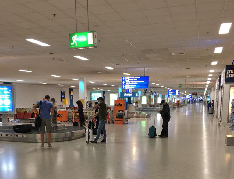 Έτσι, φτάσαμε στον χώρο παραλαβής αποσκευών, με μόνους αφιχθέντες εμάς! Ήταν ήδη όλες στον ιμάντα, και μόλις τις πήραμε δυο αστυνομικοί μας συνόδεψαν σε μια πλαϊνή έξοδο, συστήνοντάς μας συνεχώς, και πολύ ευγενικά, να τηρούμε όλοι και πάντα αποστάσεις από τους υπόλοιπους.