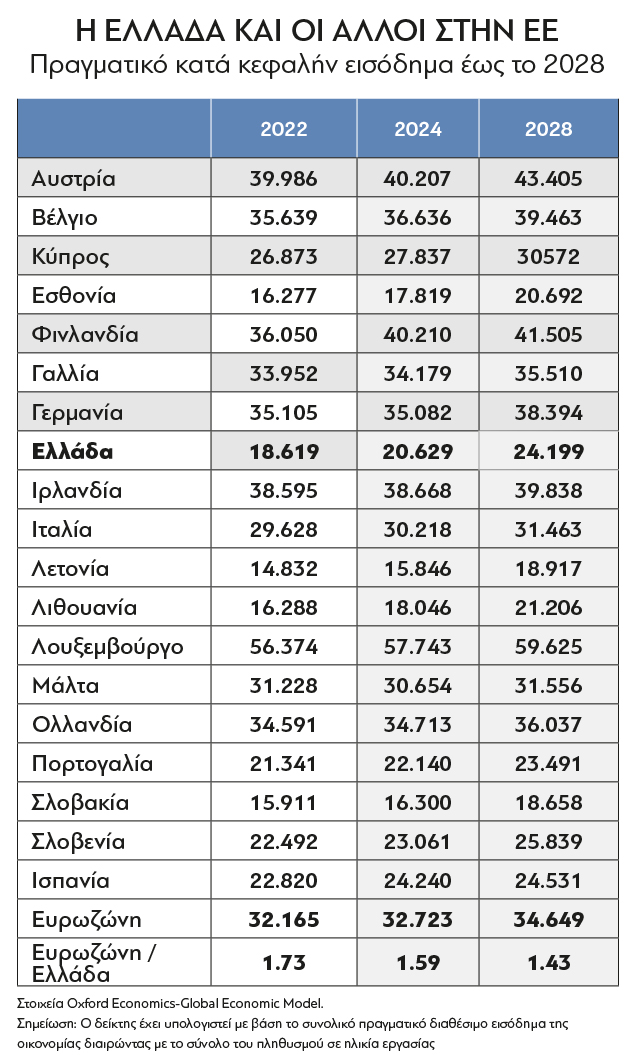 Οι προβολές μάλιστα δείχνουν ότι μέχρι και το 2028 το πραγματικό κατά κεφαλήν διαθέσιμο εισόδημα αναμένεται να είναι 1,43 φορές υψηλότερο στην Ευρωζώνη (μέσος όρος) από ό,τι στην Ελλάδα.