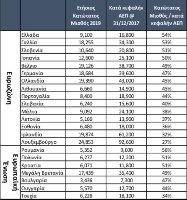 Στον πίνακα Ι βλέπετε το κατά κεφαλήν ΑΕΠ κάθε χώρας (στοιχεία 2017 από Eurostat εδώ – τα στοιχεία για το 2018 δεν είναι ακόμα διαθέσιμα), τον ετήσιο κατώτατο μισθό για το 2019 (Eurostat εδώ) και το λόγο ΚΜ/κατά κεφαλήν ΑΕΠ.