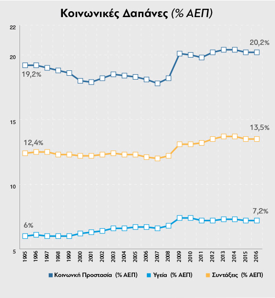 Στην Ευρώπη από το 1995 –από τότε η Eurostat διαθέτει σχετικά στοιχεία- η δαπάνη για Κοινωνική Προστασία εδώ, Υγεία εδώ και Συντάξεις1 εδώ δεν μειώνεται αλλά αυξάνεται (Διάγραμμα Ι, πηγή: Eurostat2).