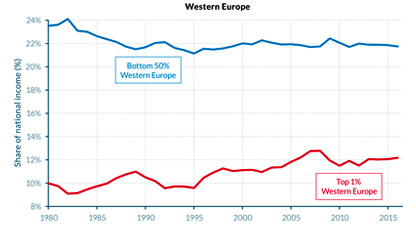 Από τη φετινή έκθεση του εργαστηρίου γα την εξέλιξη των οικονομικών ανισοτήτων κατά την περίοδο 1980-2016, προκύπτει ότι η ένταση του φαινομένου είναι πολύ μεγάλη στις αγγλοσαξονικές χώρες και πολύ λιγότερο στην ηπειρωτική Ευρώπη (Διάγραμμα ΙΙΙ). Οι ανισότητες στη Γερμανία ή τη Γαλλία διευρύνονται, αλλά με πολύ χαμηλούς ρυθμούς. Επιπλέον, εντάσσοντας στο κάδρο και τα νέα φτωχότερα κράτη μέλη της ΕΕ, που συγκλίνουν χάρις και στις μεταβιβάσεις του Ευρωπαϊκού Προϋπολογισμού από τις πλούσιες χώρες προς τις φτωχές, τότε σε επίπεδο ΕΕ οι ανισότητες δεν διευρύνθηκαν τα τελευταία 10 χρόνια.