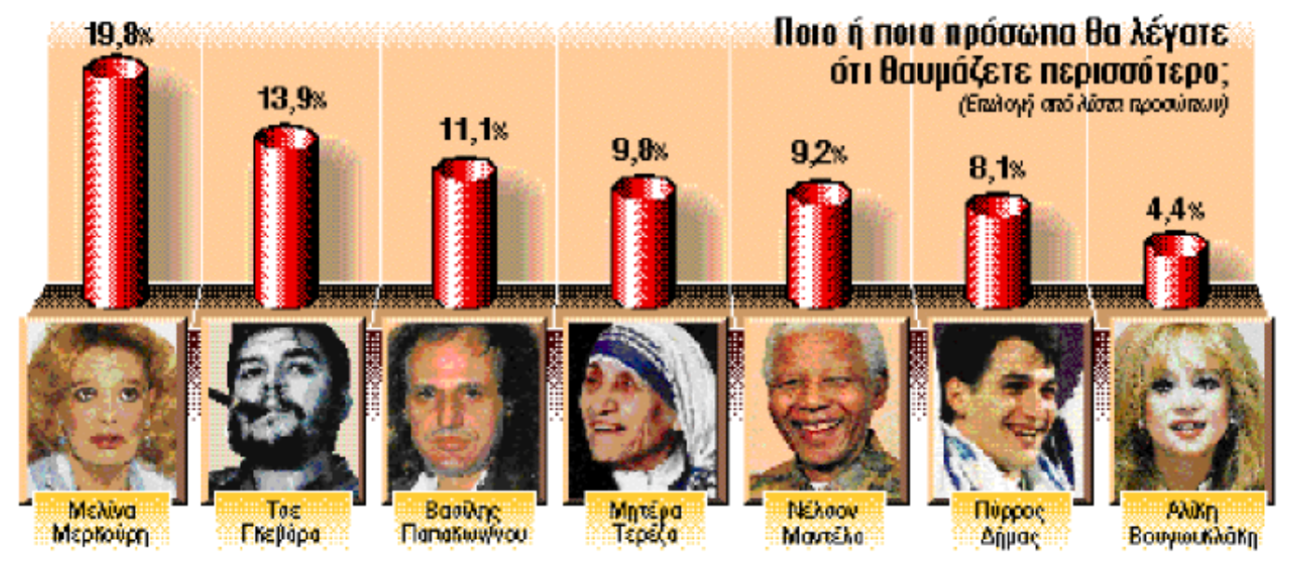 «Οταν οι νέοι μιλούν για τα πρότυπά τους το σκηνικό μπερδεύεται. Ο αέρας φέρνει κάτι από το ταμπεραμέντο της Μελίνας, η οποία συγκεντρώνει το μεγαλύτερο ποσοστό, 19,8%, την αγωνιστικότητα του Τσε Γκεβάρα, την αναρχική φωνή του Βασίλη Παπακωνσταντίνου και τον αλτρουισμό της Μητέρας Τερέζας… Η καρδιά θαυμάζει την Αλίκη, η λογική όμως ψηφίζει Μελίνα και Τσε Γκεβάρα».