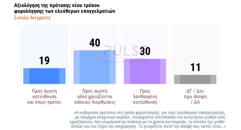 ♦ Για τη φορολόγηση των ελεύθερων επαγγελματιών, όπου η κυβέρνηση πήγε κόντρα στο παραδοσιακό της ακροατήριο (δικηγόρους, γιατρούς κ.λπ.), δημοσκόπηση της Pulse (21-23/11 για τον ΣΚΑΪ) έδειξε ότι το 59% ήταν θετικά διακείμενο:
