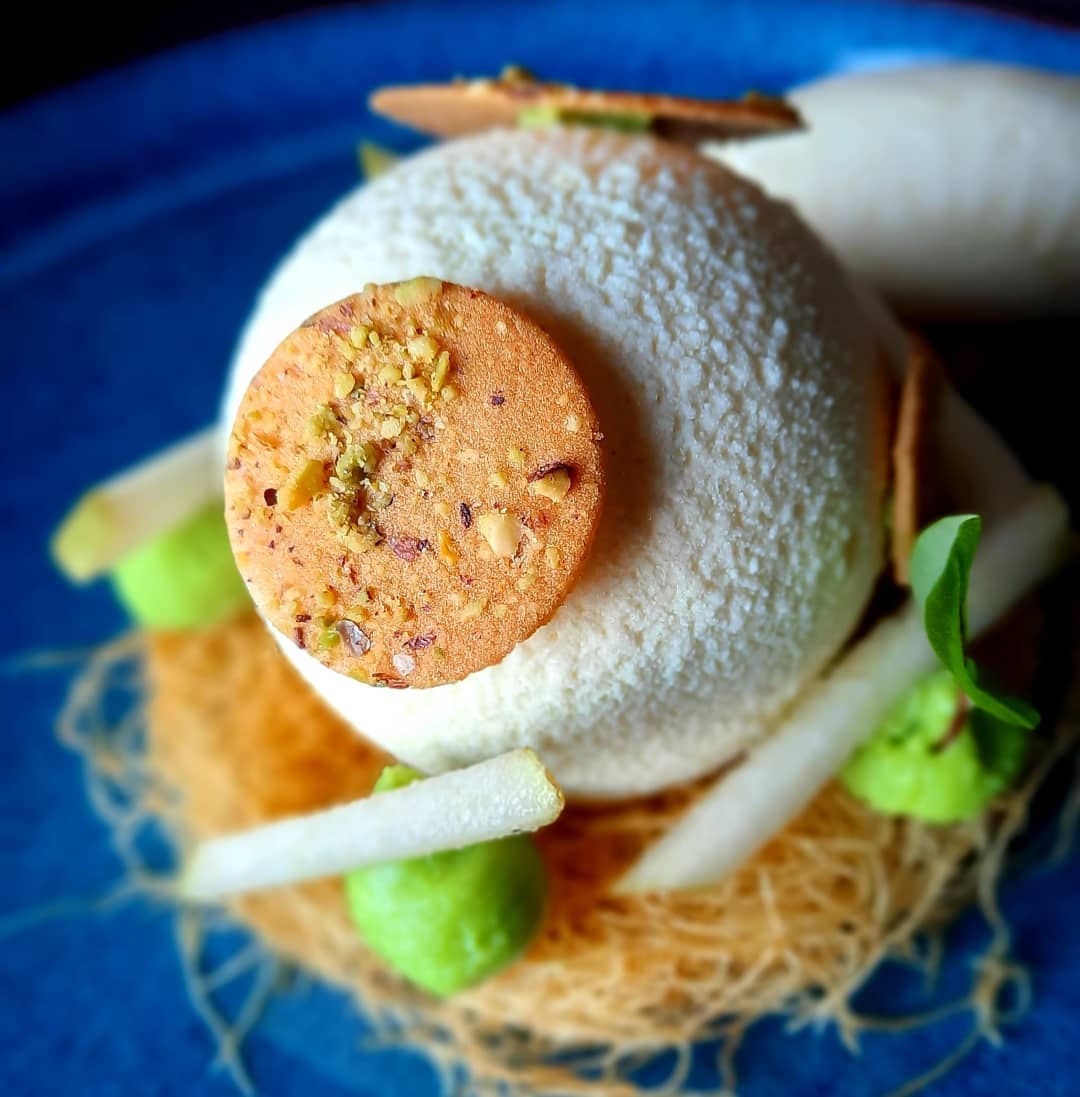 Ακολουθεί επιδόρπιο λευκής σοκολάτας με μαστίχα Χίου και κρέμα αρωματισμένη με μπαχαρικά και φιστίκια Αιγίνης, και καφές.