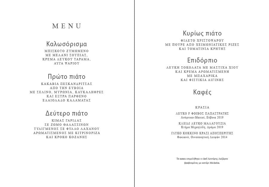 Το μενού κλείνει με τη σημείωση ότι το επιμελήθηκε ο chef Λευτέρης Λαζάρου, βραβευμένος με αστέρι Michelin…