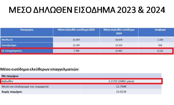 Σε σύγκριση με το 2023, ο μέσος φόρος ελευθέρων επαγγελματιών που υπάγονται στο τεκμήριο σύμφωνα με το προηγούμενο καθεστώς (κοινά ΑΦΜ) ήταν 595 + 650 ευρώ τέλος επιτηδεύματος, δηλαδή 1.245 ευρώ. Επομένως, ο μέσος επιπλέον φόρος ανέρχεται σε 813 ευρώ ετησίως.