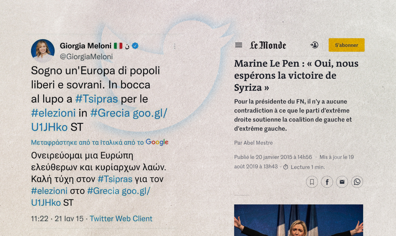 To φλερτ λαϊκισμού – Ακροδεξιάς ήταν ασφαλώς αμφίδρομο. Και περνούσε τα σύνορα. Η ευρωπαϊκή Ακροδεξιά καλωσόρισε χωρίς περιστροφές τον λαϊκισμό του ΣΥΡΙΖΑ, παρά τις «ιδεολογικές» διαφορές σε ό,τι αφορά το Μεταναστευτικό. Τόσο η Λεπέν όσο και η Μελόνι χαιρέτιζαν την επερχόμενη επικράτηση του κ. Τσίπρα το 2015. «Ελπίζουμε σε νίκη του ΣΥΡΙΖΑ» δήλωνε η Λεπέν στη Le Monde, ενώ η Τζόρτζια Μελόνι ευχόταν καλή επιτυχία στον κ. Τσίπρα με ανάρτησή της στο Twitter.