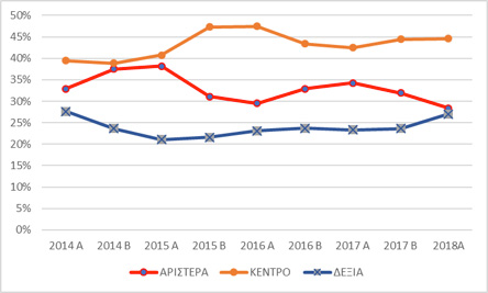 Παρατηρούμε ότι σαν πρώτη δύναμη εμφανίζονται οι κεντρώοι (45% στην τελευταία έρευνα), δεύτερη δύναμη οι αριστεροί (περίπου 28%) και τρίτη δύναμη οι δεξιοί (περίπου 27%) . Και σε πανευρωπαϊκό επίπεδοι έχουμε την ίδια σειρά αλλά με άλλα ποσοστά (42% για το Κέντρο, 34% για την Αριστερά και 22% για την Δεξιά) . Στην Ελλάδα υπάρχει ανατροπή στο διάστημα των 9 εξαμήνων που καλύπτει ο πίνακας. Οι αυτοπροσδιοριζόμενοι σαν αριστεροί μειώνονται και ισοφαρίζονται από τους αυτοπροσδιοριζόμενους σαν δεξιούς, με το Κέντρο να παραμένει η κυρίαρχη δύναμη.