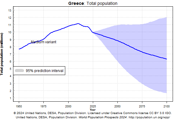Η τελευταία έκθεση του ΟΗΕ, World Population Prospects 2024, απεικονίζει σε γράφημα τη βουτιά του πληθυσμού στη χώρα μας που έχει ήδη αρχίσει. Αν συνεχιστεί η ίδια τάση, ο πληθυσμός στην Ελλάδα θα πέσει το 2100 στα 6,3 εκατομμύρια: