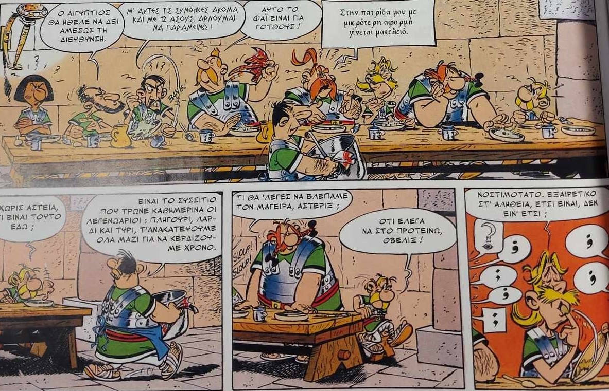 Αλλά και οι Γκοσινί και Ιντερζό μας δίνουν την ίδια ιδέα με έξυπνο τρόπο: στο «Ο Αστερίξ λεγεωνάριος», όπου Αστερίξ και Οβελίξ κατατάσσονται ως μισθοφόροι στον ρωμαϊκό στρατό, έρχεται η σκηνή όπου τρώνε φαγητό για πρώτη φορά. Ολοι, που προέρχονται από διαφορετικές φυλές και χώρες, αηδιάζουν μόλις το δοκιμάζουν – με μία εξαίρεση: τον Αγγλο, που το βρίσκει καταπληκτικό: