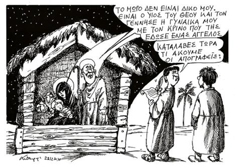 Χαρακτηριστικό της σύγχυσης ήταν και η ανάρτηση του ευρωβουλευτή του ΣΥΡΙΖΑ Παπαδημούλη, που χρησιμοποίησε μία γελοιογραφία του Πετρουλάκη από την Καθημερινή, «για να δούμε αν θα επέμβει και γι’ αυτήν η Ιερά Σύνοδος», ενώ δεν έχει καμία σχέση. Προφανώς λοιπόν δεν έχει κανένα λόγο να επέμβει, αφού εδώ δεν θίγεται κάτι – η ιστορία του τρόπου που γεννήθηκε ο Χριστός δεν διαστρέφεται και ούτως ή άλλως αφορά το υπερφυσικό και αυτό το ασυνήθιστο στοιχείο εκφράζεται μέσα από τους δύο «απογραφείς.