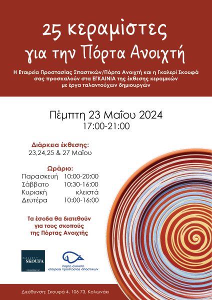 Στο Κολωνάκι (Σκουφά 4), 25 ταλαντούχοι κεραμίστες εκθέτουν και προσφέρουν τα έργα τους, για τα υπέροχα παιδιά της Εταιρείας Προστασίας Σπαστικών. Ολα τα έσοδα θα διατεθούν στην «Πόρτα Ανοιχτή» και τους σκοπούς της.