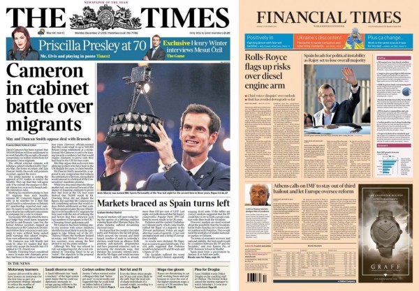 Ενδεικτικό της γενικευμένης ανησυχίας για την επόμενη μέρα στην Ισπανία, μια χώρα που επλήγη από την οικονομική κρίση την τελευταία πενταετία, είναι πώς ο διεθνής Τύπος έσπευσε να σχολιάσει το αποτέλεσμα. Ο Guardian στο δευτεριάτικο φύλλο του κάνει λόγο για «αριστερή στροφή» και τιτλοφόρησε στο πρωτοσέλιδό του το σχετικό ρεπορτάζ: «Οι αγορές επιφυλάσσονται καθώς η Ισπανία στρίβει αριστερά». Απλό την πλευρά τους οι Financial Times προβλέπουν ότι η Ισπανία οδηγείται σε πολιτική αστάθεια, εξαιτίας της ήττας του Ραχόι.