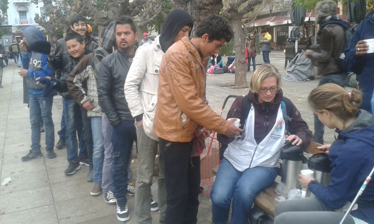 Περίπου στις 11, μια ομάδα εθελοντών από την Πορτογαλία φτάνει στο πάνω μέρος της πλατείας. Τέσσερις άνθρωποι σταματούν δίπλα στην είσοδο του ηλεκτρικού σιδηρόδρομου και γρήγορα απλώνουν κούτες με μπανάνες, κρουασάν και δεκάδες εμφιαλωμένα νερά. Το σήμα έχει δοθεί και οι μετανάστες τρέχουν γρήγορα να προμηθευτούν κάτι για τους ίδιους και κυρίως για τα παιδιά τους. Πολλοί από αυτούς είναι άρρωστοι και ζητάνε από τους εθελοντές έναν γιατρό ή κάποιο παυσίπονο. Από κάθε δρόμο της πλατείας καταφτάνουν συνεχώς και μεμονωμένα άτομα φορτωμένα σακούλες με είδη πρώτης ανάγκης.