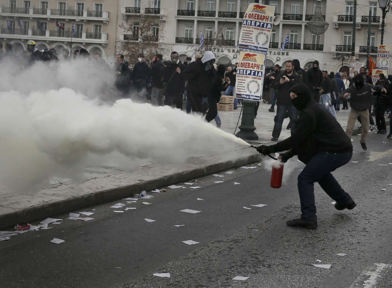 Επεισόδια σημειώθηκαν στην πλατεία Συντάγματος, μετά τη μεγάλη αντικυβερνητική διαδήλωση, με κουκουλοφόρους να συγκρούονται με αστυνομικές δυνάμεις. Η Αστυνομία έκανε εκτεταμένη χρήση χημικών και, φυσικά, με αποτέλεσμα να διαλυθεί και η συγκέντρωση των διαδηλωτών έξω από τη Βουλή.