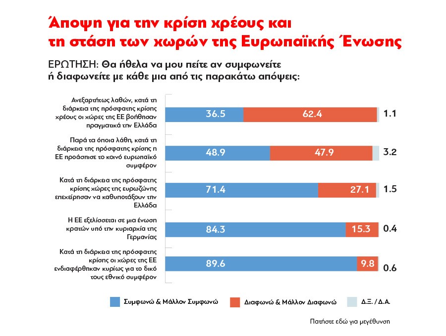 Ως Ελληνες δεν είμαστε μόνο ωραίοι. Σε ποσοστό 72,9% πιστεύουμε ότι ξεχωρίζουμε για την ευφυία και τον πολιτισμό μας. Και, με ποσοστά άνω του 50%, δηλώνουμε βέβαιοι ότι ο πολιτισμός, η παιδεία και ο τρόπος ζωής στην Ευρωπαϊκή Ενωση έχουν ωφεληθεί χάρη στη συμμετοχή μας. Βέβαια αυτό συνέβη μερικούς αιώνες πριν, αλλά εμείς, για χάρη της συζήτησης και του ηθικού μας, ας το περιορίσουμε από την είσοδο μας στην ΕΟΚ και μετά. Σε γενικές γραμμές «και χάρη τους κάνουμε», αφού το 40% από μας δεν έχει καλή άποψη για την Ευρώπη. Αυτό είναι αναπόφευκτο, καθώς το 62,4% πιστεύει ότι η Ευρώπη δεν μας βοήθησε κατά την κρίση χρέους –τα λεφτά, ας πούμε, ήρθαν από την Αφρική. Από την άλλη, όμως, αρχίζουμε, επιτέλους, να κάνουμε αυτοκριτική: το 68,8% απαντά ότι η κρίση οφείλεται στις δικές μας αδυναμίες.