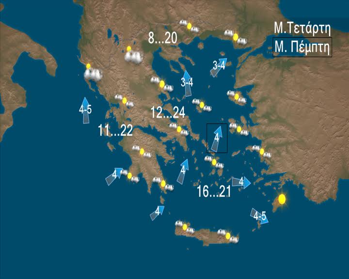 Πιο αναλυτικά σήμερα Μεγάλη Πέμπτη, οπότε κορυφώνεται η έξοδος των εκδρομέων για το εορταστικό πενθήμερο – ελέω και της μεταφοράς της αργίας της Πρωτομαγιάς για την Τρίτη του Πάσχα – ο καιρός θα είναι βελτιωμένος σε όλη την χώρα με δυτικούς νοτιοδυτικούς ανέμους που δεν θα ξεπερνούν τα 4 με 5 μποφόρ στα πελάγη και θα υπάρχουν αραιές νεφώσεις που πρόσκαιρα στα βορειοδυτικά θα είναι πυκνότερες και υπάρχει μικρή πιθανότητα πάνω από τα ορεινά να βρέξει για λίγο τις μεσημεριανές ώρες.