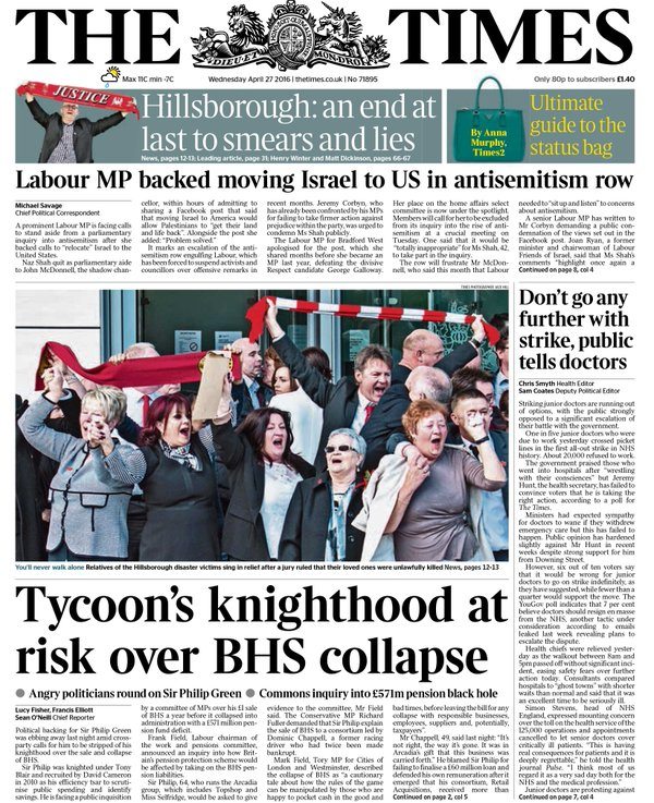 Οι Times είχαν αγνοήσει στο πρωτοσέλιδό τους την ετυμηγορία για την τραγωδία του Χίλσμπορο. Στο εσωτερικό του φύλλου είχαν αφιερώσει ένα δισέλιδο, ενώ είχε υπάρξει και ευρύτατη κάλυψη της υπόθεσης διαδικτυακά, αλλά αυτή η δικαστική δικαίωση των 96 νεκρών της ποδοσφαιρικής τραγωδίας που είχε συμβεί στο Χίλσμπορο τον Απρίλιο του 1989, δεν μπήκε στο πρωτοσέλιδο – μια αστοχία σε σχέση με την αντιμετώπιση που είχε η είδηση από το σύνολο του βρετανικού Τύπου. Ή σχεδόν το σύνολο. Και η Sun αγνόησε στο πρωτοσέλιδό της το θέμα. Και εδώ τα φαντάσματα επιστρέφουν.
