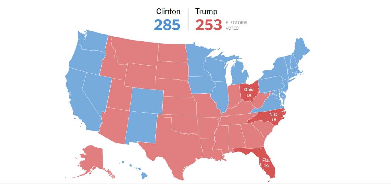 Με βάση τα τωρινά δεδομένα η Χίλαρι δεν χάνει. Προηγείται με 10% του Τραμπ και με βάση αυτό το σενάριο θα κερδίσει όλες τις Πολιτείες που είχε κερδίσει το 2012 ο Μπαράκ Ομπάμα καθώς και τη Βόρεια Καρολίνα (την οποία ο νυν πρόεδρος είχε κερδίσει το 2008, αλλά χάσει το 2012). Αυτή τη στιγμή τα ποσοστά της συζύγου του 42ου προέδρου των ΗΠΑ Μπιλ Κλίντον είναι χειρότερα από αυτά του Ομπάμα το 2012 μόνο στην πολιτεία της Νέας Υόρκης, την οποία όμως είναι εξαιρετικά δύσκολο να χάσει από τον Τραμπ. Μολονότι ο επιχειρηματίας είναι σύμβολο της Νέας Υόρκης – ασύμμετρο σύμβολο αλλά σύμβολο – η Χίλαρι, που είχε εκλεγεί στη Νέα Υόρκη γερουσιαστής το 2006, έχει ακλόνητα ερίσματα σε αυτήν την Πολιτεία.