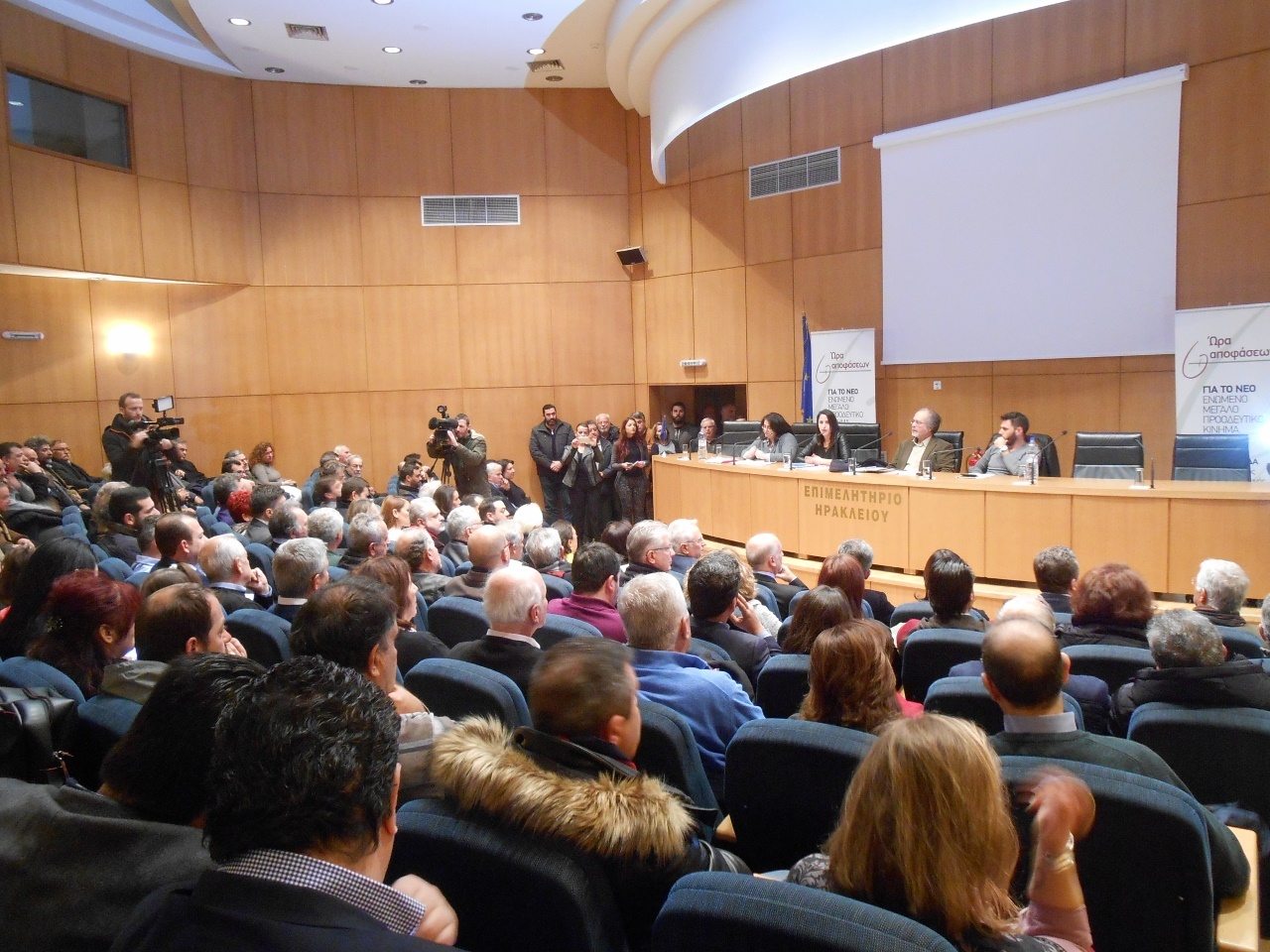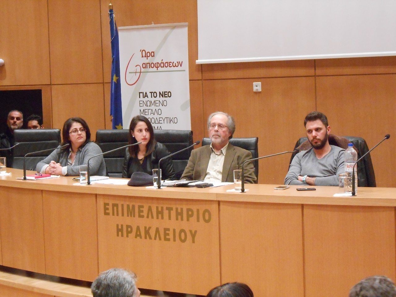 Ομιλητές ήταν οι Αννα Διαμαντοπούλου, Γιάννης Ραγκούσης, Γιώργος Φλωρίδης και Αντιγόνη Λυμπεράκη, ως εκπρόσωπος του «ΠΟΤΑΜΙΟΥ». Στο προεδρείο της εκδήλωσης, το οποίο απηύθυνε ερωτήσεις στους ομιλητές, συμμετείχαν ο Ιωσήφ Γρυσπολάκης, καθηγητής στο Πολυτεχνείο Κρήτης και πρώην Πρύτανης· η δικηγόρος Μαρία Δαμανάκη, επικεφαλής της νεολαίας του «ΠΟΤΑΜΙΟΥ»· η δημοσιογράφος Σοφία Τζεδάκη· ο Λευτέρης Μπιμπάκης, οικονομολόγος – σύμβουλος επιχειρήσεων.
