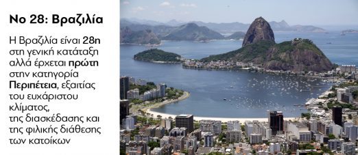 Η Ελλάδα της κρίσης, της ανεργίας, της ανασφάλειας, του Προσφυγικού, βρίσκεται στην 29η θέση! «Σκοράρει» ψηλά στα αποτυπώματα της κληρονομιάς της και στην περιπέτεια που προσφέρει. «Ο ελληνικός πολιτισμός έχει διαμορφώσει μοναδικά χαρακτηριστικά στην επιστήμη, στις τέχνες, στις κοινωνικές επιστήμες και στην κουζίνα. Στην Ελλάδα γεννήθηκε η τραγωδία και το θέατρο, καθώς και επιστήμες όπως η πολιτική επιστήμη. Η ελληνορθοδοξία είναι η κυρίαρχη θρησκεία, αλλά η ανεκτικότητα στις θρησκείες είναι κατοχυρωμένη στο Σύνταγμα της χώρας», σημειώνει η μελέτη στην περιγραφή.