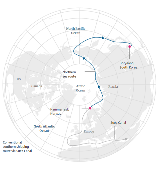 Το τάνκερ Christophe de Margerie μετέφερε υγροποιημένο φυσικό αέριο από τη Νορβηγία στη Νότια Κορέα μέσα σε 19 ημέρες. Είναι ένας χρόνος 30% χαμηλότερος από την συμβατική διαδρομή που διέρχεται από τη διώρυγα του Σουέζ.
