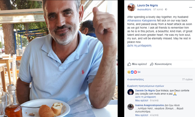Με μια συγκινητική ανάρτηση η Ντε Νίγκρις αποχαιρέτησε τον συζυγό της, ενημερώνοντας ότι ένιωσε αδιαθεσία γυρνώντας σπίτι του από έξοδό τους και κατέληξε από καρδιακή προσβολή.