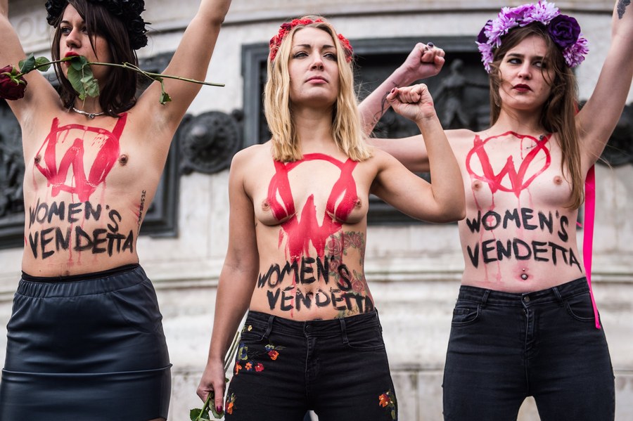H συγκυρία, με τις αποκαλύψεις στο Χόλιγουντ και το παγκόσμιο κίνημα του #MeToo κατά της σεξουαλικής παρενόχλησης, ήταν ιδανική. Ωστόσο ο κόσμος στο Παρίσι δεν ήταν πολύς. Και έτσι οι Femen έκλεψαν την παράσταση – όχι ότι είναι δύσκολο για τα μέλη της ακτιβιστικής οργάνωσης που διαδηλώνουν γυμνόστηθες.
