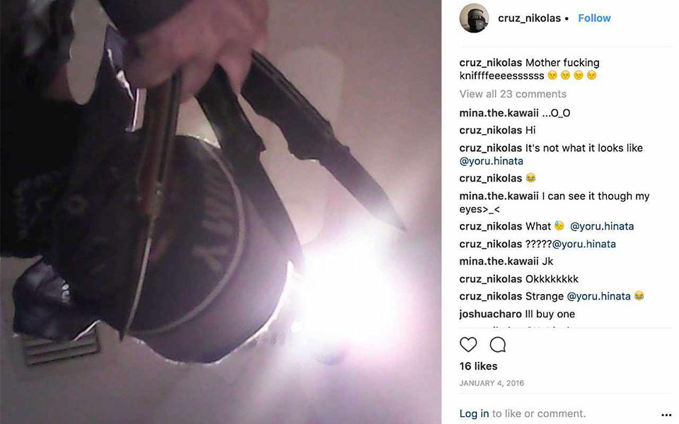 Σε άλλες ποζάρει κρατώντας όπλα και μαχαίρια ενώ σε μία άλλη φαίνεται ένας πυροβολημένος, στο κέντρο, στόχος με τον ίδιο τον Κρουζ να γράφει στη λεζάντα «στα αλήθεια αξίζει να το δοκιμάσει κανείς».