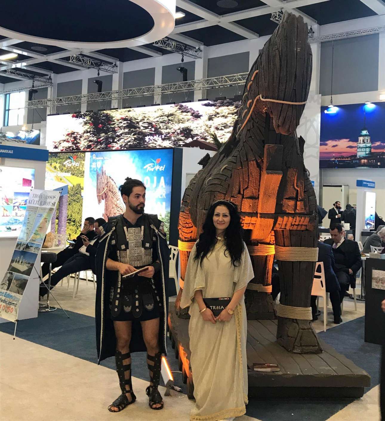 Έναν όροφο πιο πάνω η Τουρκία είχε απλώσει ένα τουριστικό «υπερθέαμα» σε όλη την έκταση της αίθουσας 3.2: ψηφιακές οθόνες, αμμουδιά, ομπρέλες και προσομοίωση παραλίας, έναν Δούρειο Ίππο για το φετινό Έτος Τροίας (υπήρχε άλλος ένας και έξω από το εκθεσιακό κέντρο), περίπτερο για τα μνημεία πολιτιστικής κληρονομιάς της UNESCO, προορισμοί με αυτόνομη παρουσία (Καππαδοκία, Κουσάντασι κ.λπ.) και ένας τοίχος με φωτογραφίες από μποστάνι με τίτλο… «Natural Aegean Cuisine».