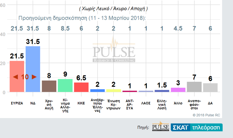 Αυτό δείχνει νέα δημοσκόπηση της εταιρείας Pulse για τον ΣΚΑΪ, η οποία παρουσιάστηκε το βράδυ της Πέμπτης.