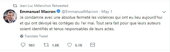 Ο Μελανσόν μάλιστα φρόντισε να κάνει retweet μια ανάρτηση του ίδιου του Μακρόν την επεισοδιακή Πρωτομαγία, στο οποίο ο πρόεδρος υποσχόταν την παραδειγματική τιμωρία των μπαχαλάκηδων.