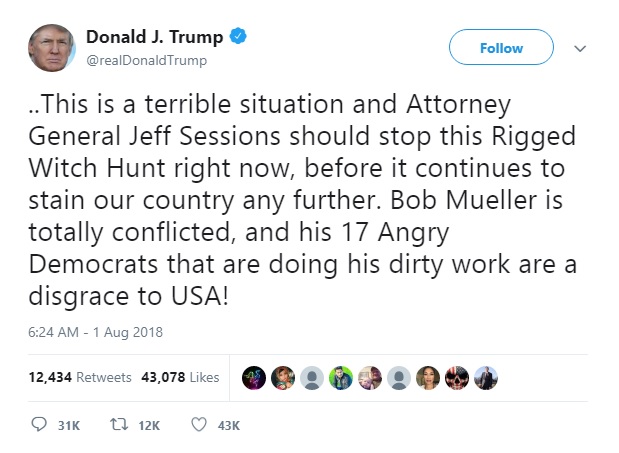 Ο κ. Τραμπ υποστηρίζει ότι η έρευνα υπονομεύεται από τη σύγκρουση συμφερόντων του ειδικού εισαγγελέα Μιούλερ και αποτελεί αντικείμενο εκμετάλλευσης από τους πολιτικούς αντιπάλους του. Στο σχετικό προεδρικό tweet της Τετάρτης 1 Αυγούστου τονίζεται ότι ο υπουργός Δικαιοσύνης πρέπει «να βάλει τέλος αμέσως σε αυτό το στημένο κυνήγι μαγισσών προτού αυτό κηλιδώσει και άλλο τη χώρα μας».