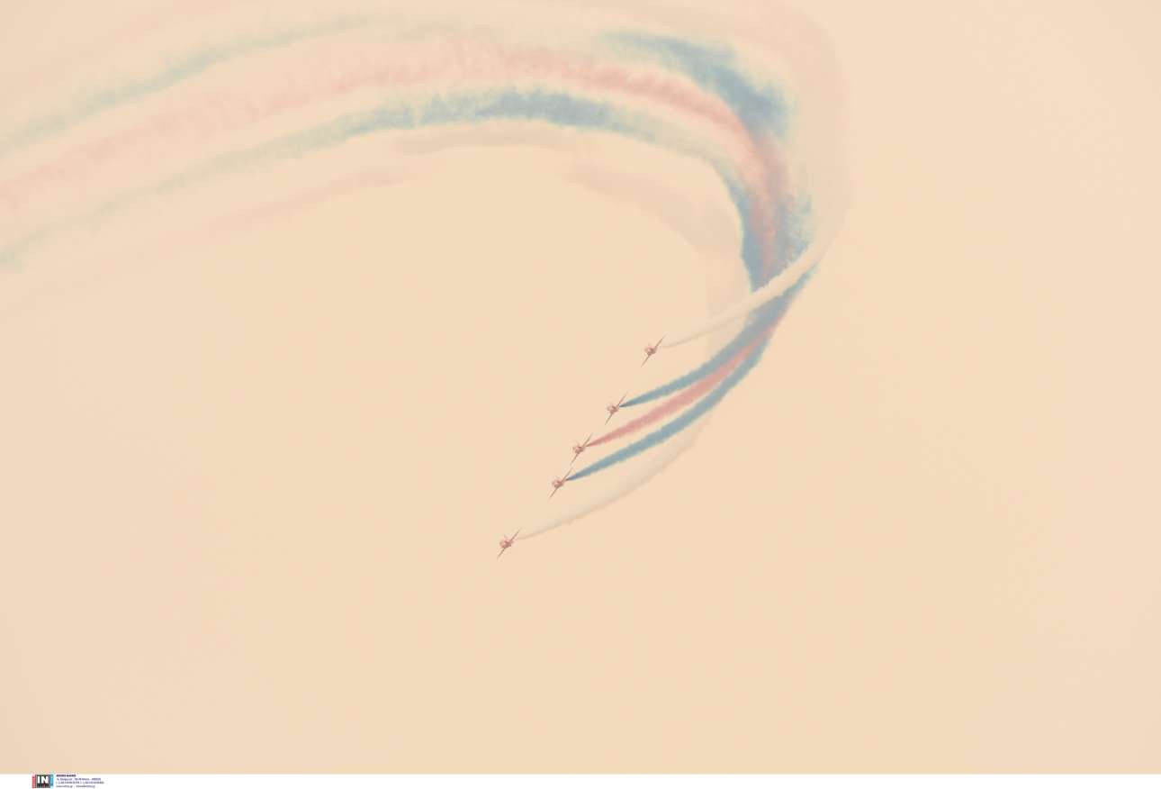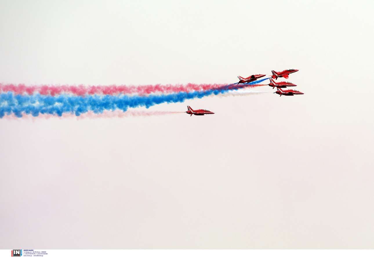 Αεροπορική επίδειξη από τα αεροσκάφη της πτητικής ομάδας «Red Arrows» της βρετανικής Βασιλικής Πολεμικής Αεροπορίας (RAF) πραγματοποιήθηκε το μεσημέρι του Σαββάτου στον Φλοίσβο Παλαιού Φαλήρου.