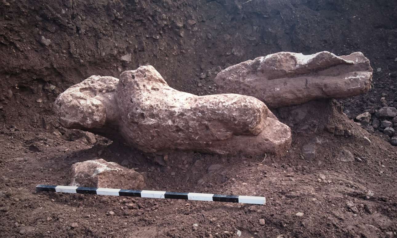 Ειδικότερα, διευκρινίζεται ότι στην πρώτη δοκιμαστική τομή στο βόρειο τμήμα του αγροτεμαχίου βρέθηκε πώρινο γλυπτό φυσικού μεγέθους αρχαϊκών χρόνων, που σώζεται από την κεφαλή ως το ύψος των μηρών και παριστάνει όρθια, γενειοφόρο μορφή νεαρού άνδρα με προτεταμένο το αριστερό πόδι. Το παραπάνω γλυπτό βρέθηκε μαζί με τμήμα κάτω κορμού μικρότερου πώρινου αναγλύφου που απεικονίζει ιστάμενη γυμνή ανδρική μορφή από την οσφυϊκή χώρα ως τις κνήμες, το οποίο επίσης φέρει συμφυή πλίνθο στην οπίσθια επιφάνεια.