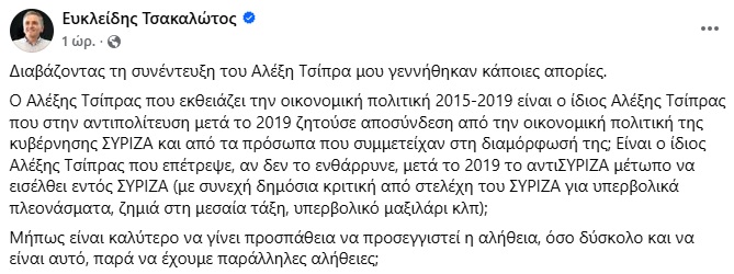 Η πιο χαρακτηριστική ήρθε από τον Ευκλείδη Τσακαλώτο, ο οποίος υπήρξε υπουργός Οικονομικών επί ΣΥΡΙΖΑ-ΑΝΕΛ και τώρα είναι κοινοβουλευτικός εκπρόσωπος της Νέας Αριστεράς. Ο κ. Τσακαλώτος προέβη, το μεσημέρι της Παρασκευής (22.08) σε μια ανάρτηση 105 λέξεων στα social media, στην οποία διατύπωσε κάποιες απορίες για την στάση του κ. Τσίπρα μετά το 2019, όταν και, κατά τον πρώην υπουργό Οικονομικών, ο ΣΥΡΙΖΑ προσπάθησε να αποσυνδεθεί από τις οικονομικές πολιτικές του 2015-19 ενώ επιτράπηκε η δημόσια κριτική στελεχών (βλέπε Παύλος Πολάκης).