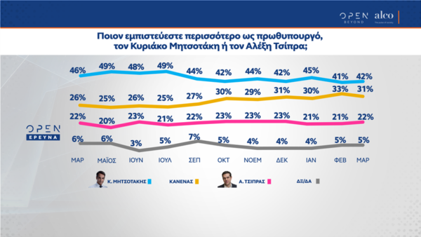 O Πρωθυπουργός Κυριάκος Μητσοτάκης εξακολουθεί να ισχυρό προβάδισμα έναντι του Αλέξη Τσίπρα στις θετικές γνώμες για τη στάση και το έργο του. Το 48% τον κρίνει θετικά έναντι του 30% για τον αρχηγό του ΣΥΡΙΖΑ. Στο ερώτημα «ποιον εμπιστεύεστε περισσότερο για πρωθυπουργό», Μητσοτάκη «ψηφίζει» το 42%, Τσίπρα το 22% και… «κανένα» το 31%.